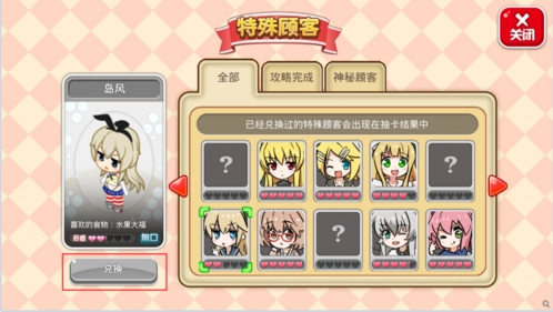 2.特殊顾客好感到三星才可以兑换,另外五星顾客兑换之后的天赋技能也是随机的,在魅惑、加速、日料、西餐、中华、甜点、调酒七个技能里面随机一个,所以你人品够好(làn)的话,是可以换到足足20个魅惑的哦。