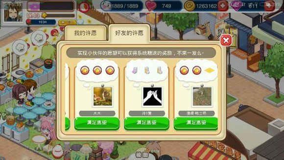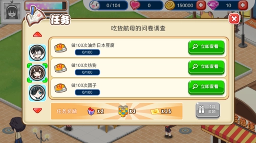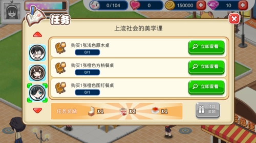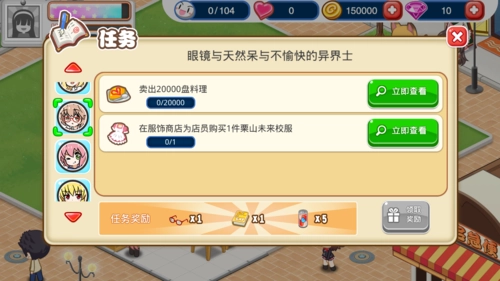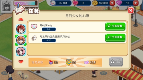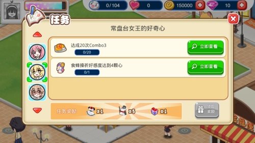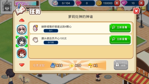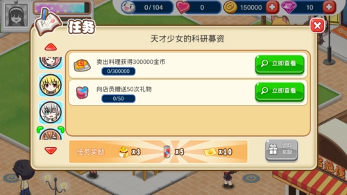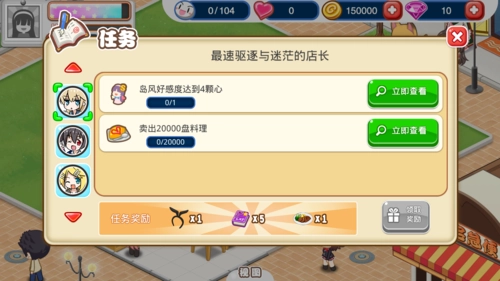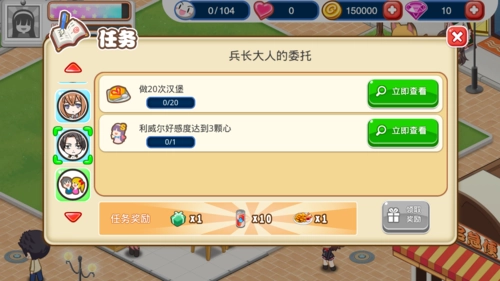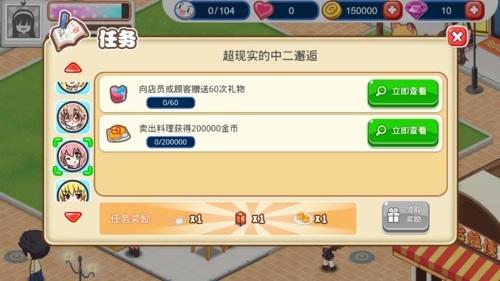 顾客在店里用餐后,有一定概率会出现爱心图标,点击图标赠送礼物可以增加好感度。不同的SP顾客性格不同,赠送礼物的好感加成也不一样。越往后,每颗心对应的好感度数值越高,升级的难度也就越大。SP顾客的任务中,有些会解锁新菜品,建议尽量完成这些任务——虽然难度不小,但多花些时间应该就能搞定,只是那些需要氪金的任务确实有点遗憾。