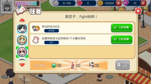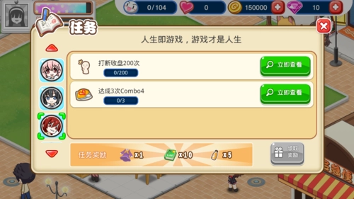 2、然后跟着新手教程的任务一直走啦,再任务中会交一些基础操作。任务分为三种,主线任务(黄色);支线任务sp顾客任务(蓝框),至于如何解锁sp顾客任务,请转第三点sp顾客篇。