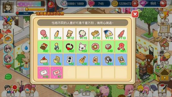 和店员互动能提升好感度,不过目前我还不清楚,除了能解锁成就奖励、更换不同服装外,提升店员好感度还有什么其他作用……不同类型的礼物对不同性格的店员加成效果不一样,最好能找到让礼物收益最大化的方式。有两个紫色情书的加成是固定的,分别对应10点和50点好感,其他礼物和性格的对应收益我还在统计中。当然,到了游戏后期通常不会缺礼物,像我现在白色礼物每种都有100多个,绿色的50多个,蓝色的30多个,大情书也有十五本呢。