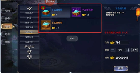 强化粉来源:商城购买、摆摊中购买、每日蜃楼炼境玩法中获得。