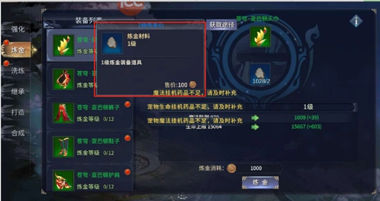 炼金材料:炼金时会消耗铜币和炼金材料(炼金石)。不同炼金等级的装备消耗不同等级的炼金石。
