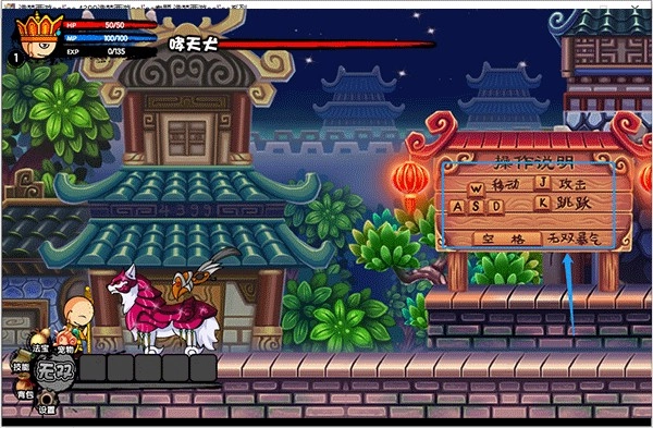 4、在游戏内的右边有操作方法,wasd移动,j攻击、k跳跃、空格无双暴起
