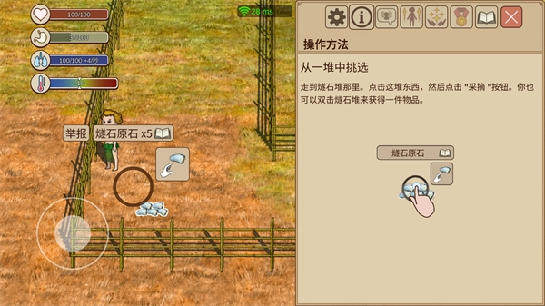 2、遇到灌木丛,点击它可查看操作菜单,然后点击采摘按钮,或者双击灌木丛,就能采摘食物,获取可食用的物品。