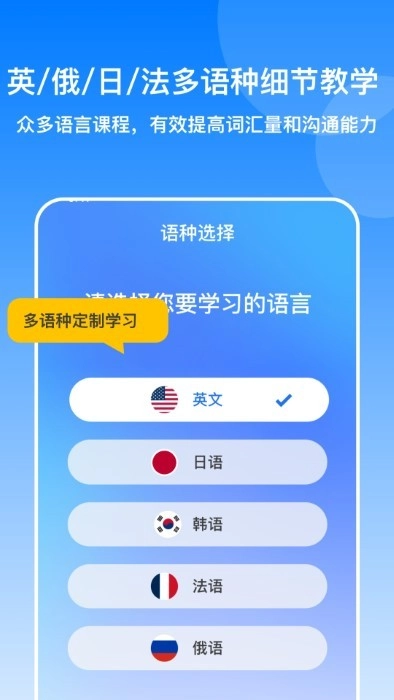 多语种学习:提供丰富的语言学习选项,涵盖英语、法语、德语、西班牙语、日语、韩语、俄语等众多语种。学习者能够依据自身需求,自由挑选想要学习的语言。