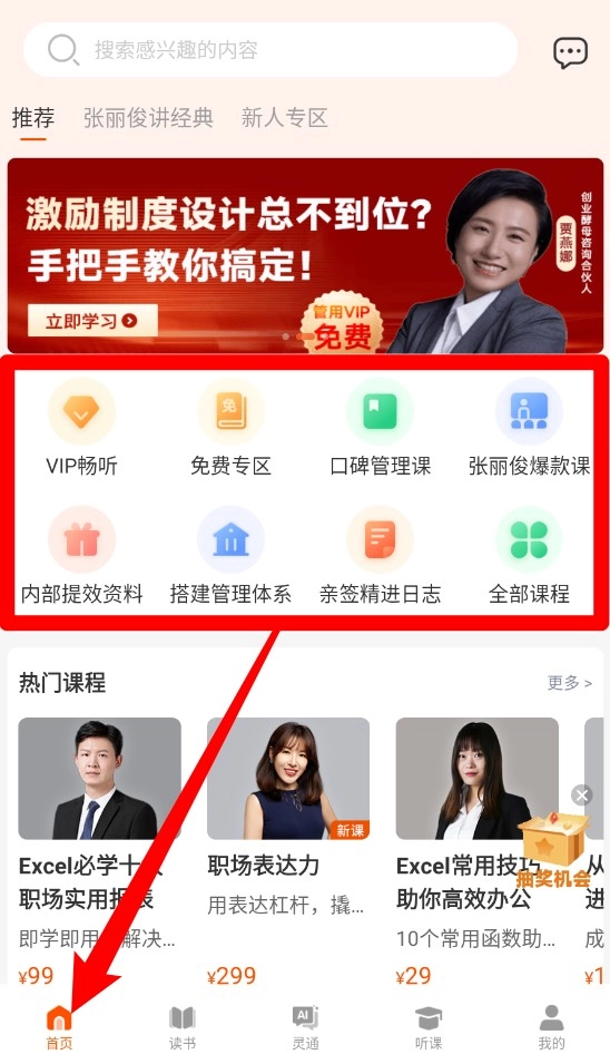 1、首页显示推荐内容与课程分类,点击图标可快速进入不同学习版块。