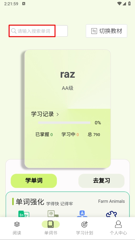 4、在单词书板块,搜素单词进行学习。