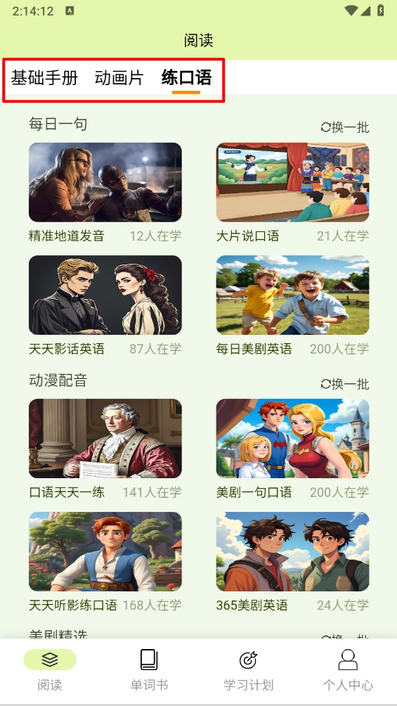 2、在主页涵盖基础手册、动画片和练口语,根据所需点击进入学习。