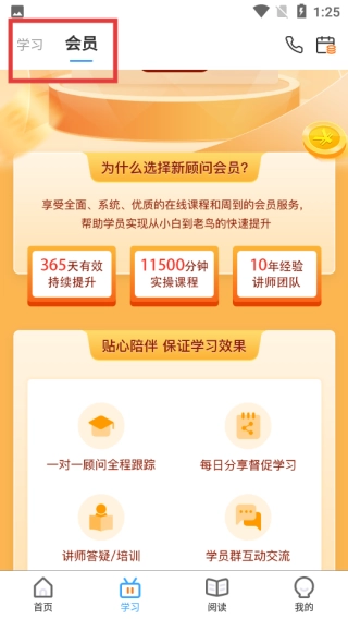 2. 切换至【学习】页面,能够在【学习】与【会员】标签之间进行切换,以查看会员权益等相关信息。