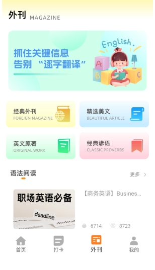 4、外刊页面可以阅读经典外刊、美文等,还可以进行语法阅读
