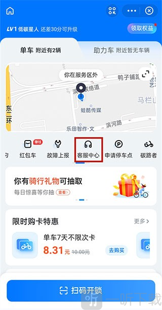 1. 就拿支付宝来说,打开该软件,在搜索栏里输入哈啰出行,搜索出来后点击单车选项,接着再点击客服中心。