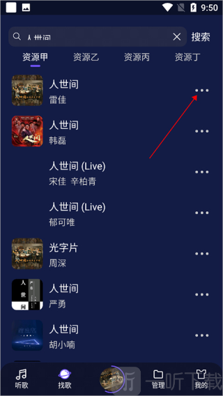 1. 于找歌页面中搜索心仪歌曲,接着点击歌曲列表右侧的扩展菜单图标。