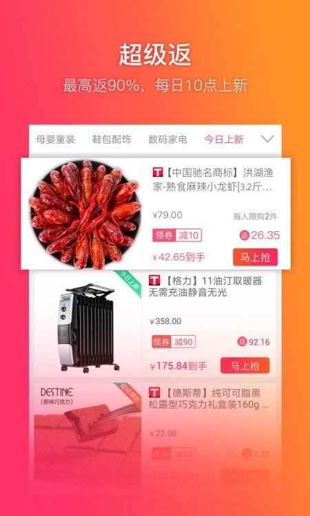 每日10点精选商品上新,不仅有专属优惠券,下单还能享受返利,最高返利可达90%!