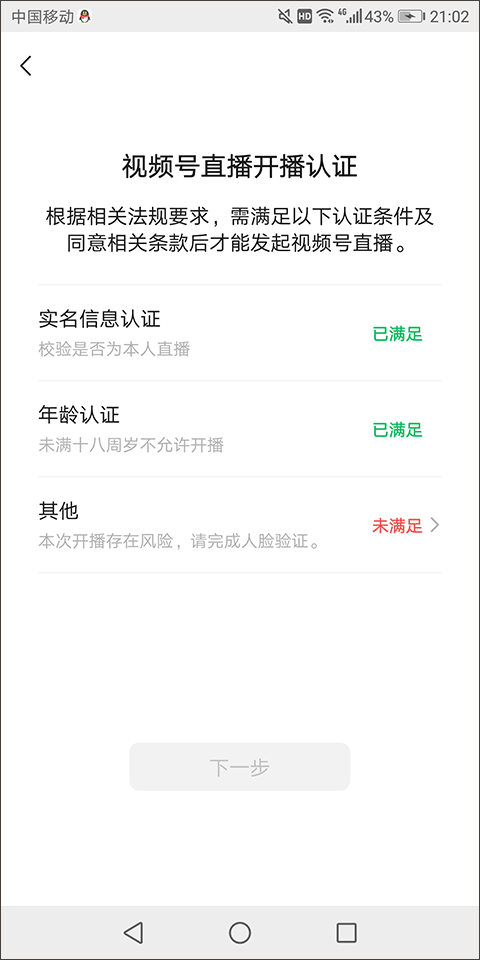 4、在此处完成实名认证信息、年龄认证及其他信息的填写后,找到并点击“下一步”选项。