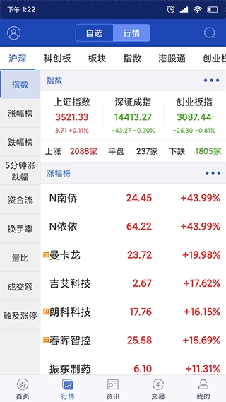 5、向用户提供股票沪A、沪B、深A、深B、中小板及港股的排名列表。排名类别涵盖:振幅、涨幅、成交量、金额。用户挑选不同项目,便能获取不同排行。