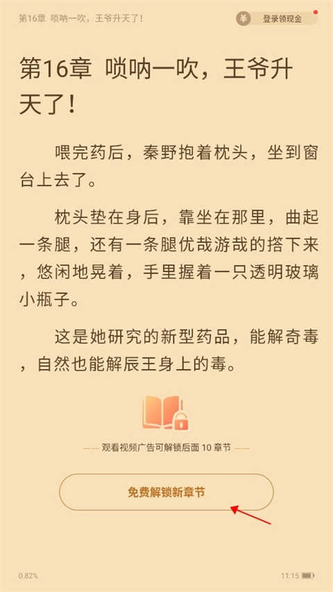 1、阅读小说时,若遇到需解锁章节,点击“免费解锁”选项。
