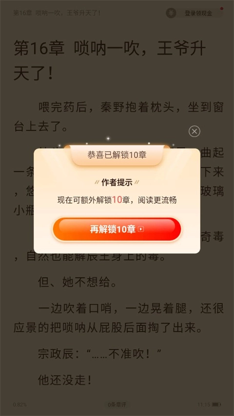2、观看广告后,能够解锁10章内容。要是还想解锁更多内容,既可以继续观看广告,也可以开通会员。