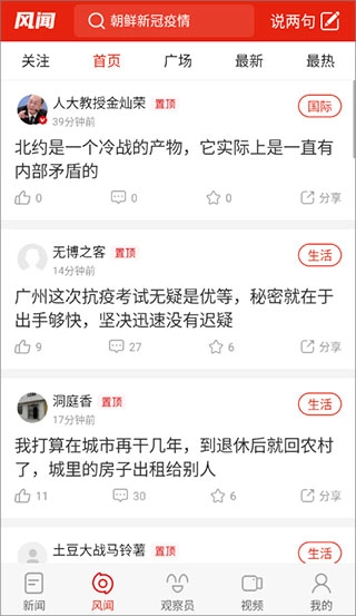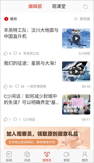 3、在【观察员】页面,可以看到平台为你筛选的新闻内容,方便用户查看实时新闻热点;