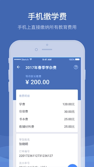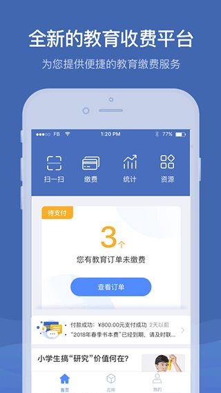 1、对接“教育收费平台”,接收学校推送的缴费订单,可直接通过手机完成缴费操作。