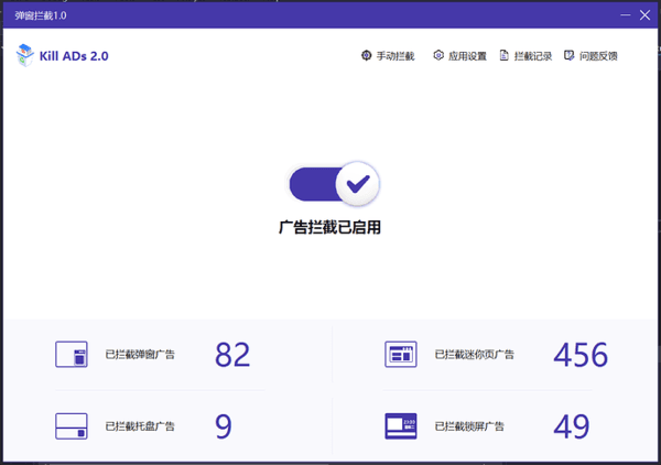 「广告拦截助手」能够拦截mini页、右下角托盘图标闪烁、锁屏类全屏弹窗以及各类弹窗广告。