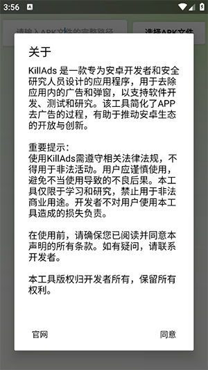 使用KillAds工具时,用户需遵守国家相关法律法规,严禁将其用于任何非法活动。请谨慎使用本工具,因不当使用引发的一切不良后果均由用户自行承担。此外,KillAds仅限用于学习与研究目的,禁止用于非法商业活动。开发者对用户使用本工具所造成的任何损失不承担责任。