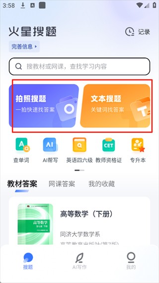 1、在本站下载安装并打开火星搜题的最新版本,进入应用首界面后,能看到平台的题库资源十分丰富。