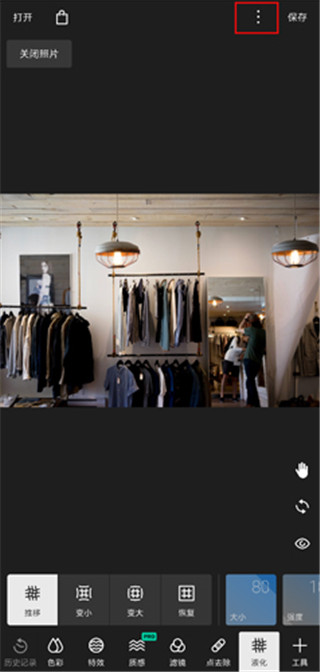 1、安装本站提供的泼辣修图软件后,首先找到界面右上角的三点按钮并点击。