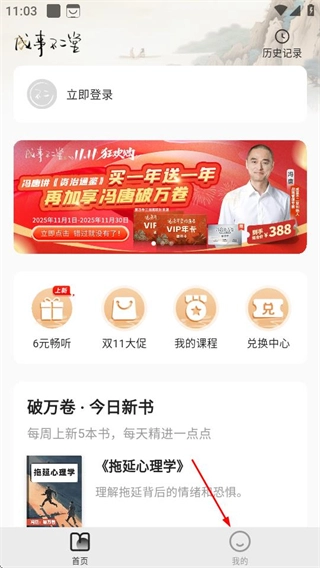 1、在成事不二堂界面,点击右下角我的选项,进入个人页面。