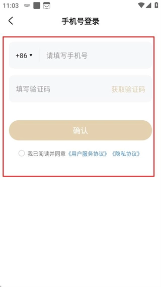 4、在手机号登录界面,输入信息,勾选协议后点击确认即可登录。