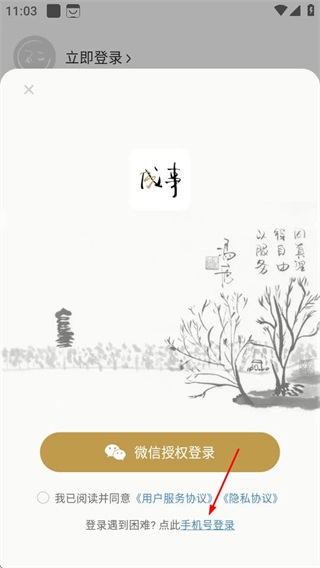 3、在登录选择页面,点击手机号登录,进入手机号登录界面。