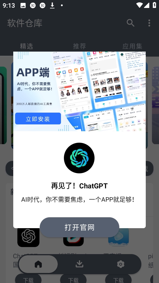 2.进入软仓App的首页,首页可看到精选、推荐和应用集