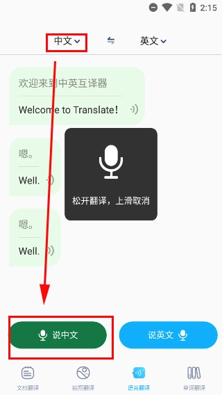 3、关于语言翻译功能,我们可以通过切换上方的选项来更换当前输入的语种;按住下方的录音按钮就能开始录音,等把要说的话都讲完后松开按钮,系统就会自动开始翻译。