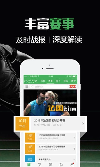 3. 参与赛事:在“赛事”板块查看即将举行的羽毛球赛事信息,并在线报名参与。
