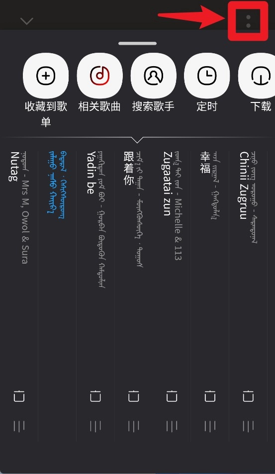 4、点击右上角的“更多”按钮,即可进入播放列表管理界面,在这里可以进行收藏、设置定时以及对多首曲目进行批量操作。