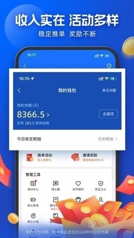 2、配送流程简单,送餐方便快捷,收入真实可靠,平台活动丰富多样且订单资源充足,还支持自定义筛选功能,助力骑手找到高价值订单。