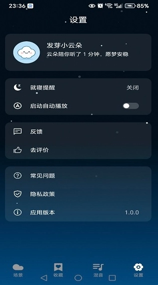 在设置页面,支持入睡提醒功能,还能开启助眠音乐自动播放服务。