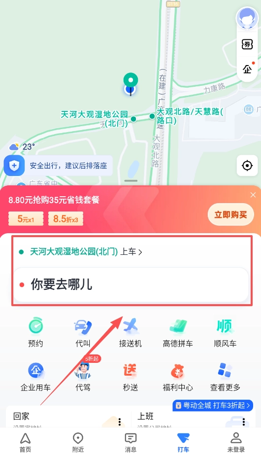 3、规划行程时,在打车界面输入起点和终点,高德会提供从实时打车到企业用车等多种选择,你可以根据人数和预算。