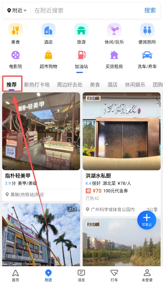 2、查找周边服务时,进入附近页,各类生活需求如电影院、加油站等都汇聚于此,直接点选所需类别,快速找到目标。