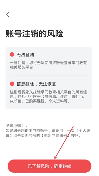 4、在【账号注销的风险】页面点击【已了解风险,确定继续】完成注销操作。