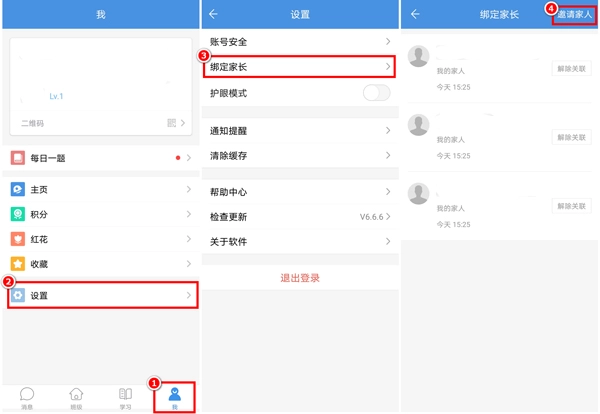 学生登录,点击“我”-“设置”,点击“绑定家长”-“邀请家长”,输入相关信息即可发送邀请。