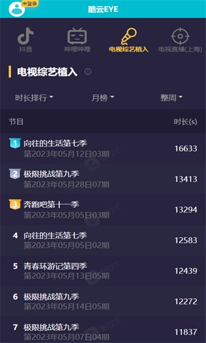 3、节目排名榜单,支持按日、周、月维度呈现收视排行情况,覆盖电视剧、综艺、新闻等各类内容品类。