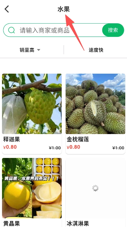 1、进入水果板块,搜索商家或商品,浏览多样水果(如释迦果、金枕榴莲等)。