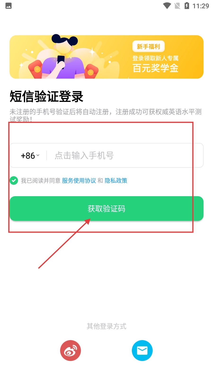 1、在短信验证登录页面,输入手机号,勾选同意协议后点击【获取验证码】。
