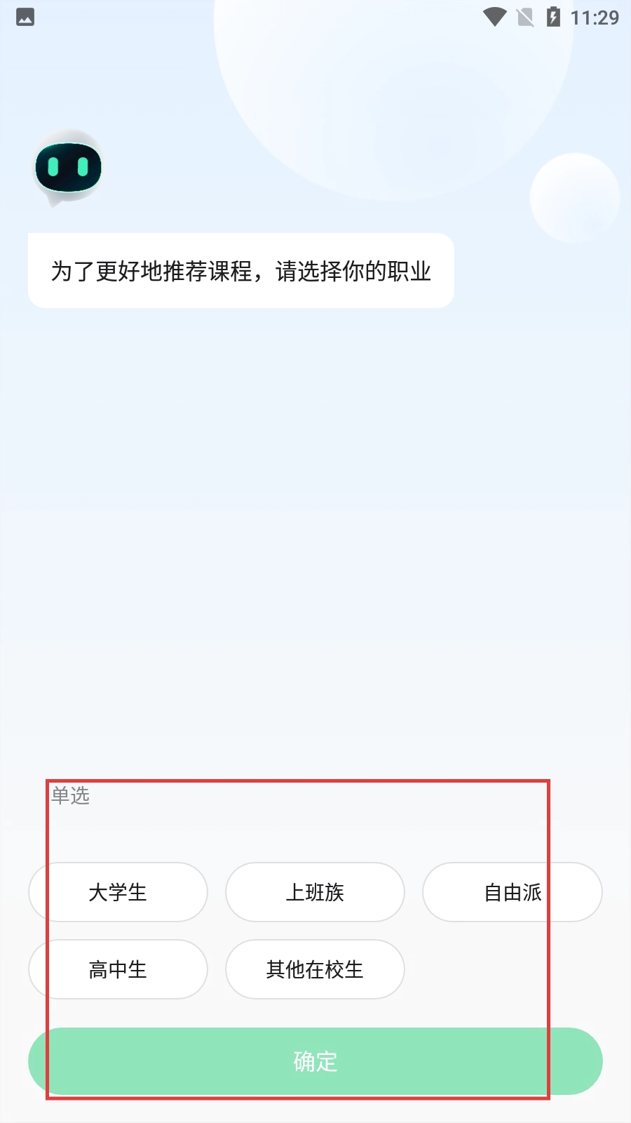3、登录后,挑选自身的职业类别(例如大学生、上班族等),点击【确定】按钮,即可完成个性化配置。