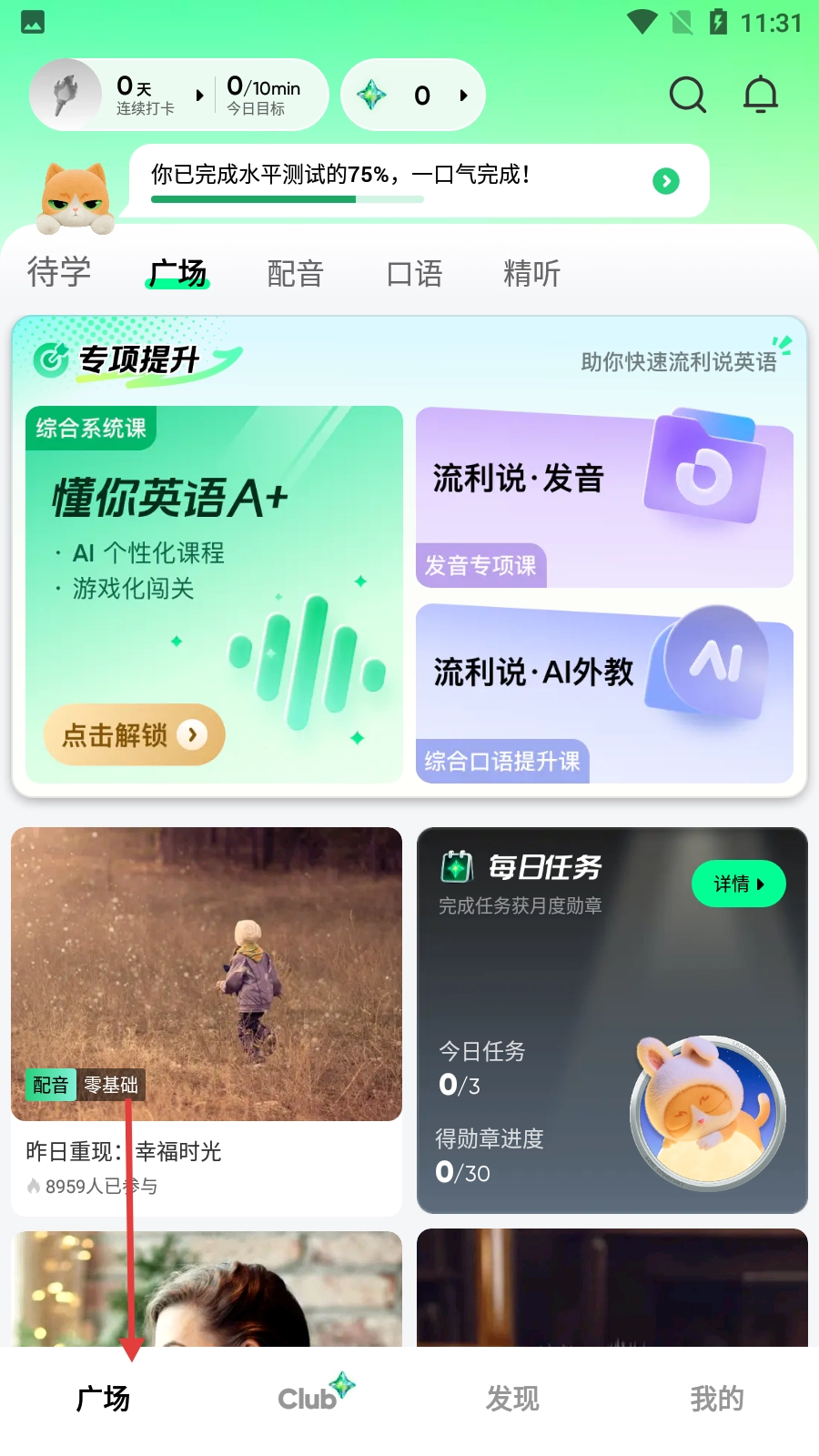 4、进入首页后,可在【广场】板块浏览专项提升课程、配音任务等各类英语学习内容,开启英语学习之旅。