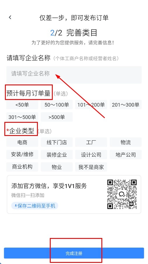 4、填写企业名称,选择预计每月订单量、企业类型,点击【完成注册-按钮】,完成注册流程。