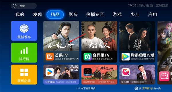 打开软件后,进入精品分类页面,能看到芒果TV等内容,可浏览这些精品类的资源内容。
