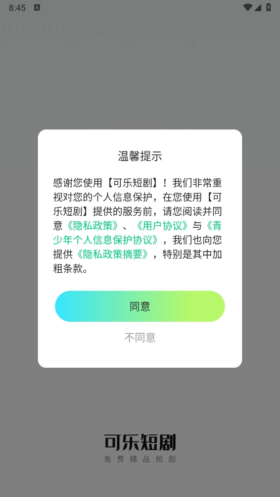 1、安装可乐短剧,同意相关的政策与协议之后打开。