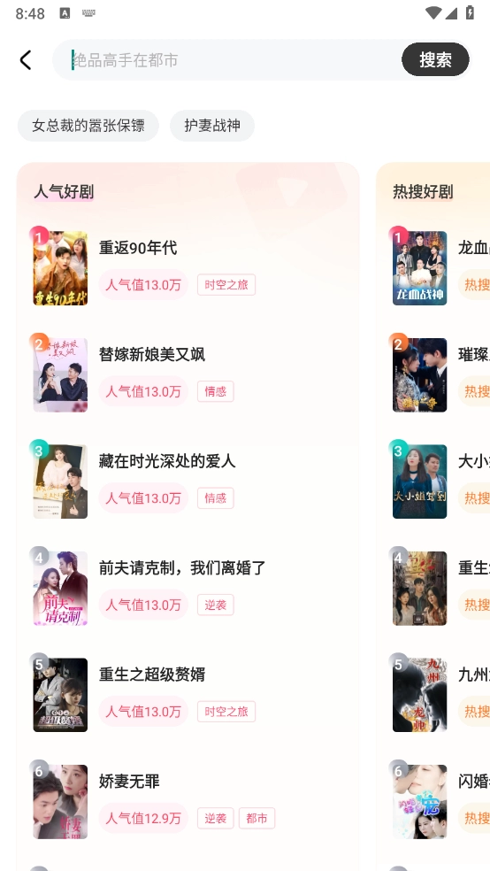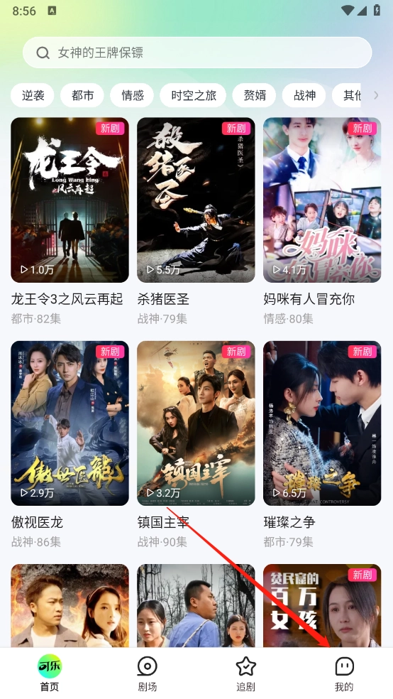 进入软件后,首页汇聚了丰富多样的短剧类型,涵盖逆袭、都市、情感、战神等类别。