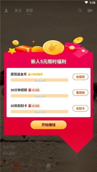 1、新人上线就可以领取5元,然后点击观看视频